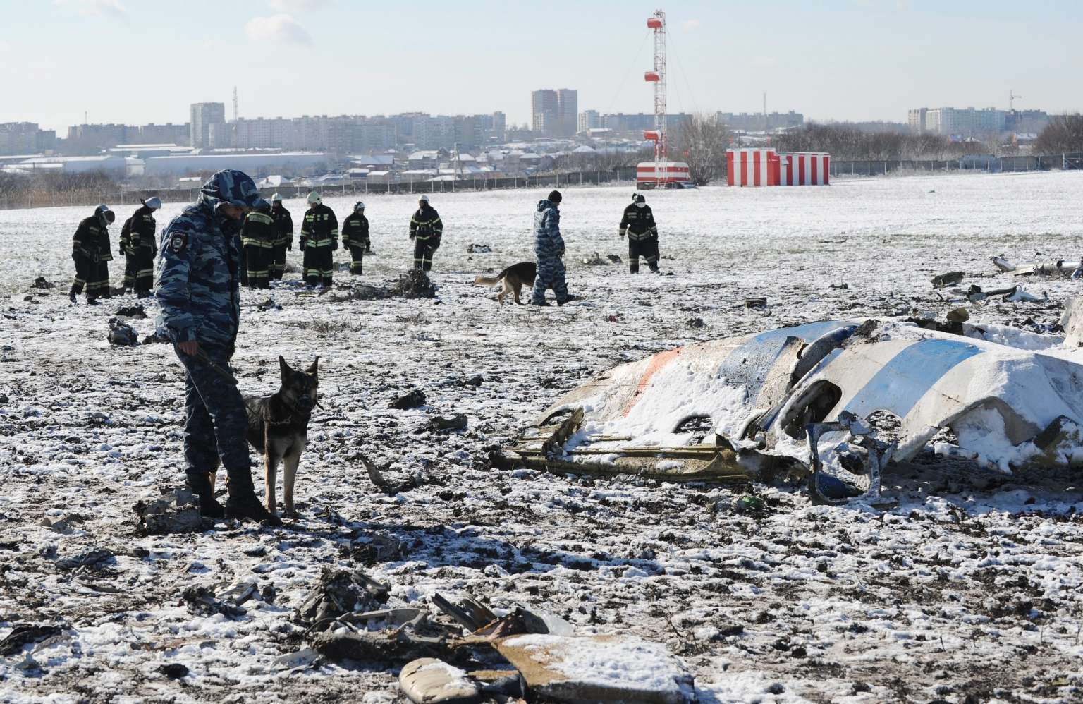 Russian investigators and policemen inspect a site of the crash of Boeing 737-800 of FlyDubai airliner at the airport of Rostov-on-Don, Russia on March 20, 2016.