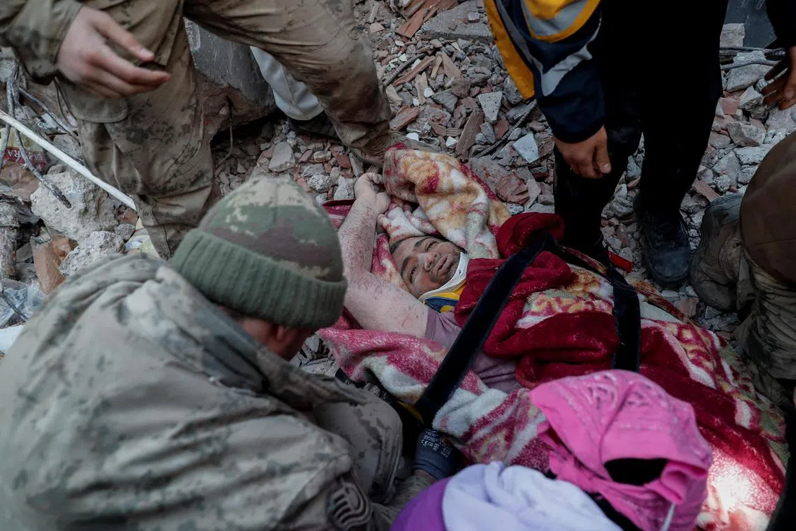 Rescuers attend to survivor Gokhan Ugurlu in the aftermath of a deadly earthquake, in Hatay, Turkey, on Feb 12, 2023.