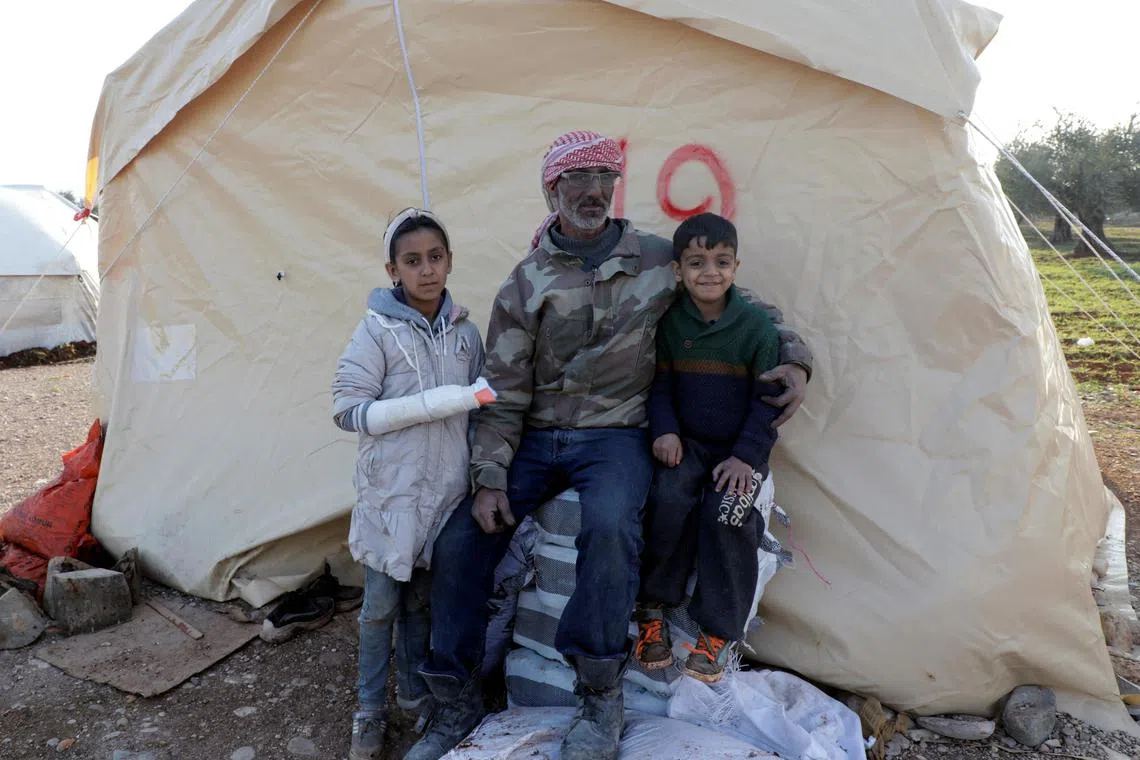Earthquake survivor Abdullah Rasheed Aboud sits with his children outside tents for people affected by the earthquake, in Jandaris, Syria, on Feb 11.