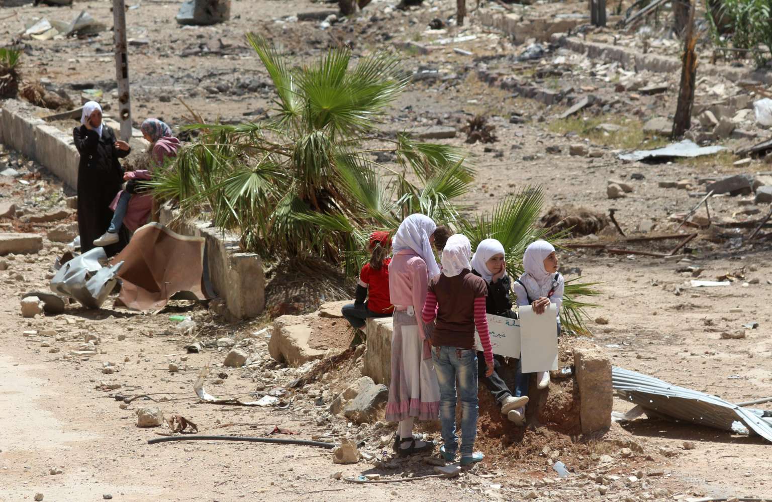 Syrian girls holding placards in Daraya on May 23. The town was one of the first to erupt in demonstrations against the government, and one of the first to be placed under a strict regime siege in late 2012.