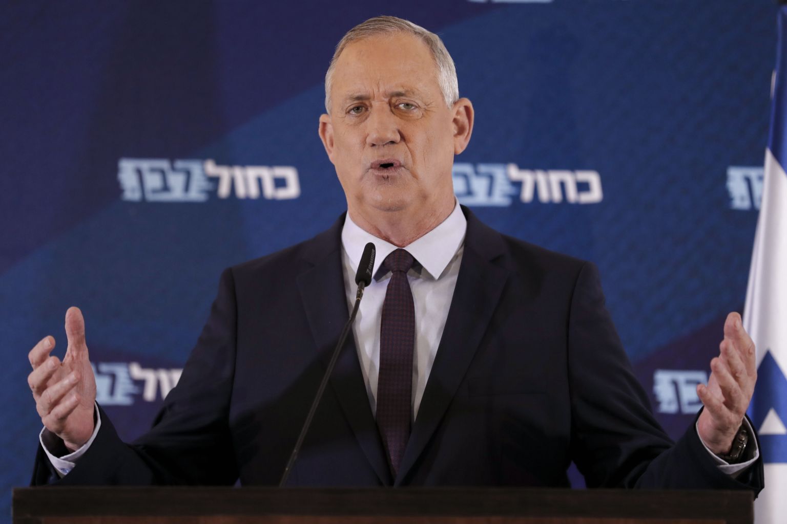 In a photo taken on March 7, 2020, the leader of Israel's Blue and White electoral alliance Benny Gantz delivers a statement in the central Israeli city of Ramat Gan.