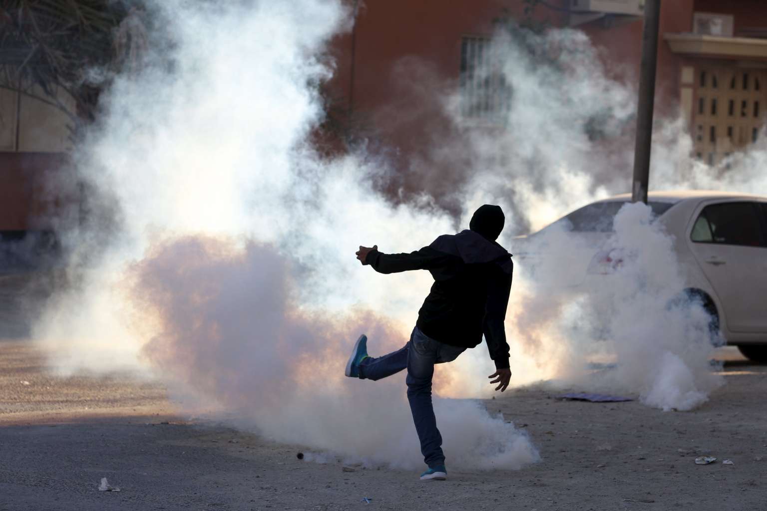 A protester kicks a tear gas canister fired by riot police away from fellow protesters during anti-government clashes in Sitra, Bahrain on Sunday.
