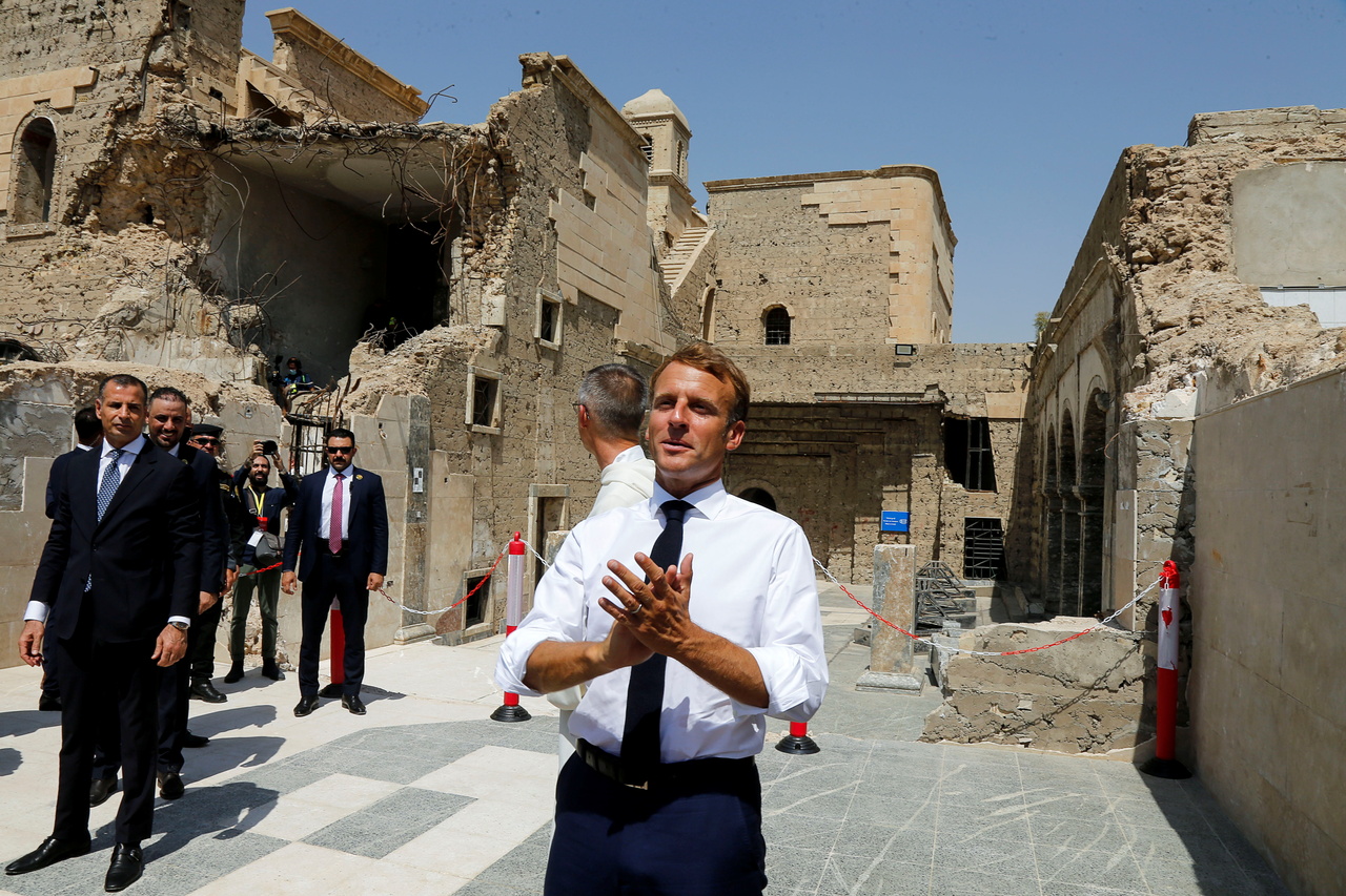 French President Emmanuel Macron visiting the Al-Sa'ah church in Mosul, Iraq, on Aug 29, 2021.