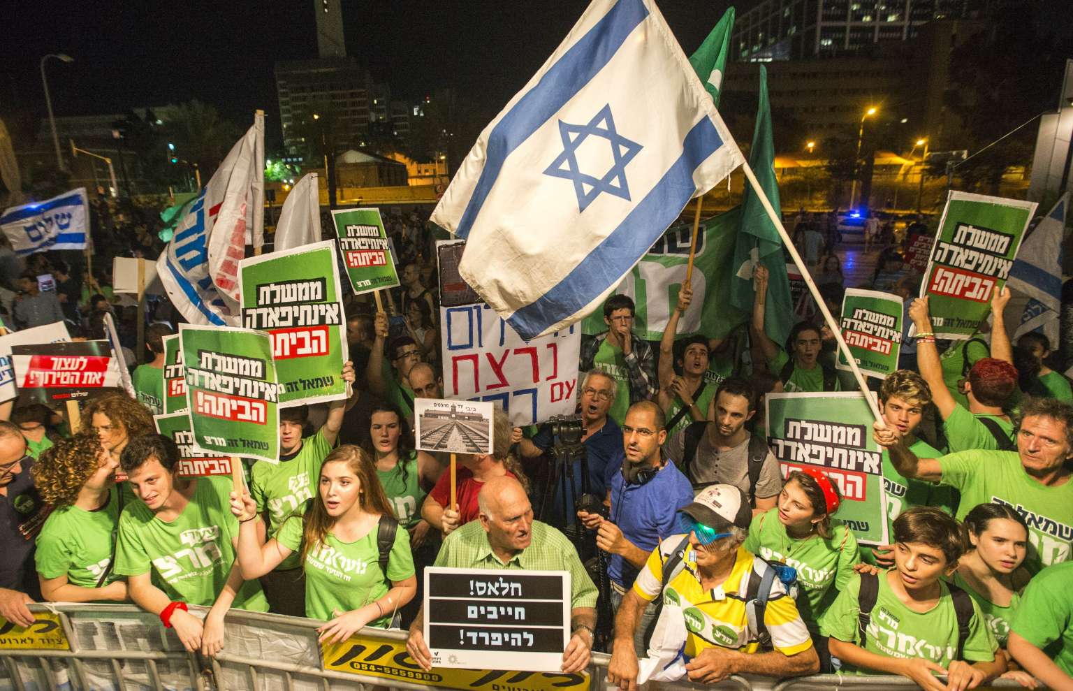 Israeli left-wing activists hold banners and wave their national flag during a rally in Tel Aviv on October.