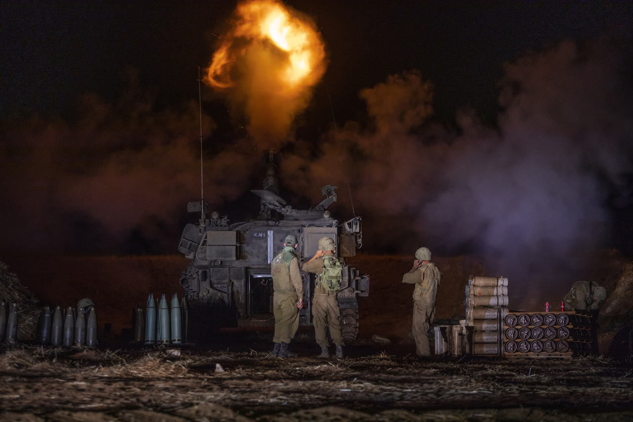 Israeli soldiers prepare a 155mm self-propelled shell to fire towards the Gaza Strip near Sderot, Israel, on May 13, 2021.