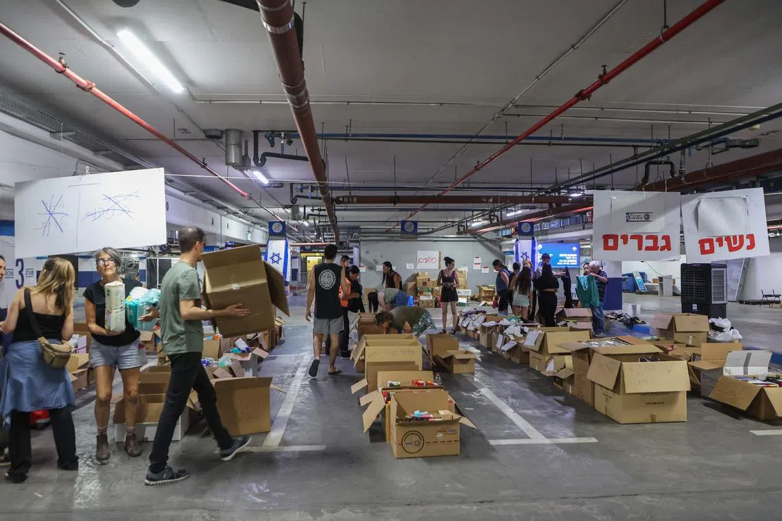 Volunteers prepare aid packages and supplies for Israeli soldiers and evacuated residents in Tel Aviv on Oct 12, 2023.