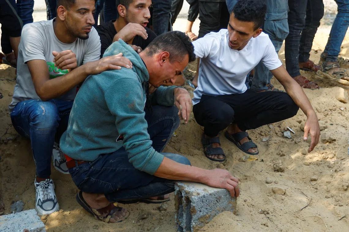 A man mourns the death of Palestinians from the Samour family, who were killed in Israeli strikes on their house, at a land near to their home as the residents struggle to find spaces in cemeteries, in Khan Younis in the southern Gaza Strip.