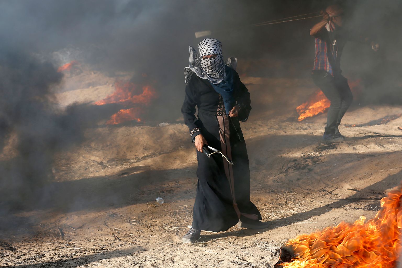 A Palestinian protester holds a slingshot during a demonstration at the Israel-Gaza border on Aug 10, 2018.