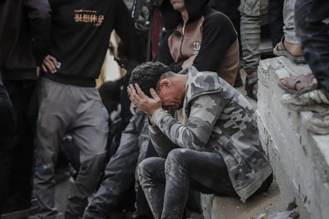 A Palestinian man grieves during a search following an Israeli airstrike at a refugee camp in Jabaliya, northern Gaza, on May 23.