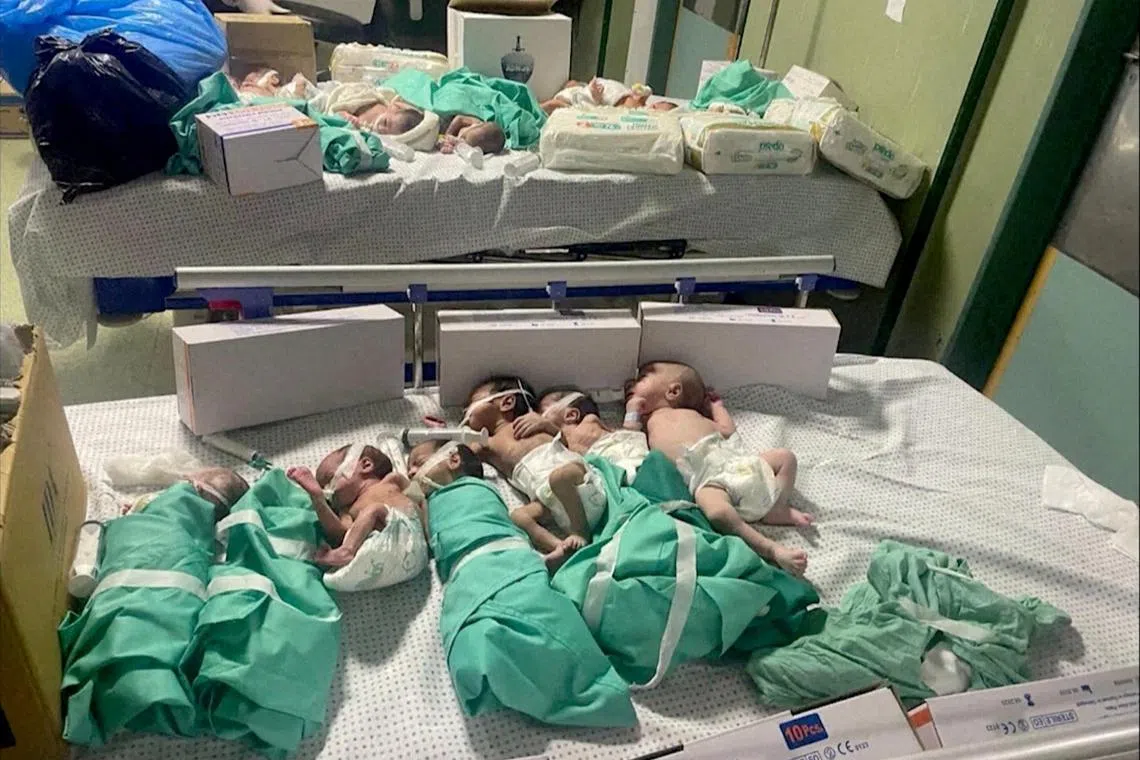 Newborns are placed in bed after being taken off incubators in Gaza’s Al Shifa hospital following a power outage, in Gaza City on Nov 12.