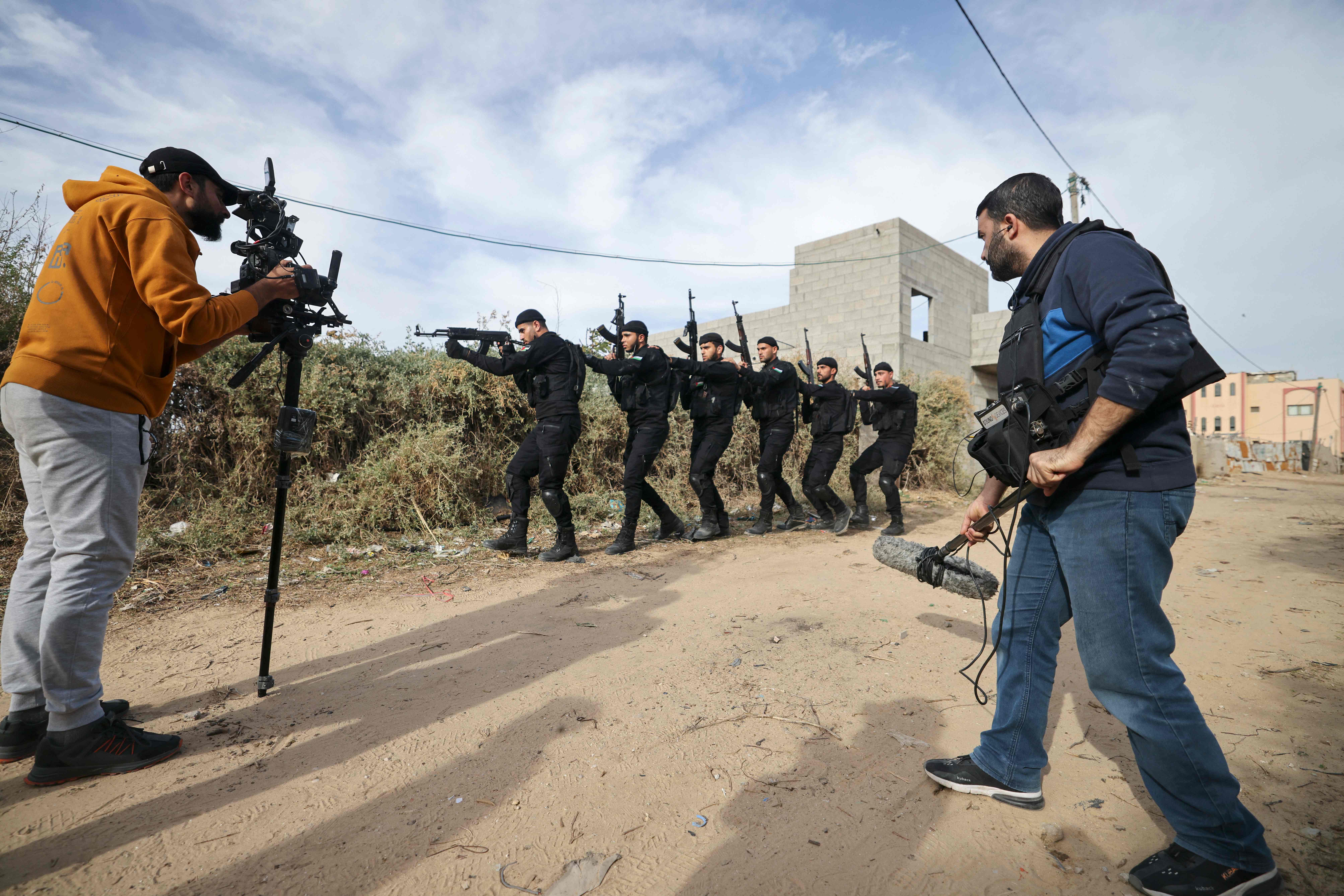 Palestinian actors and crew shoot a scene of the series "Qabdat al-Ahrar" (Fist of the Free) in Gaza city on Dec 6, 2021.