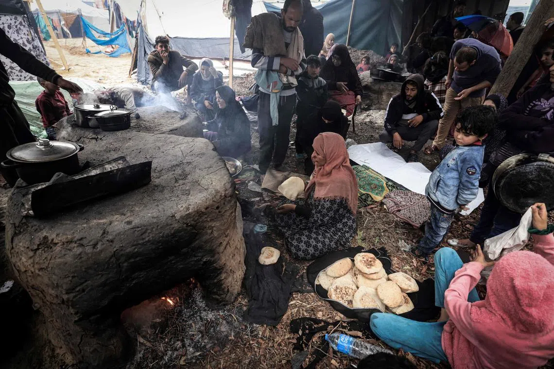 Palestinian women making bread in ovens at a makeshift camp housing displaced Palestinians, in Rafah in the southern Gaza Strip, on Jan 2, 2024.