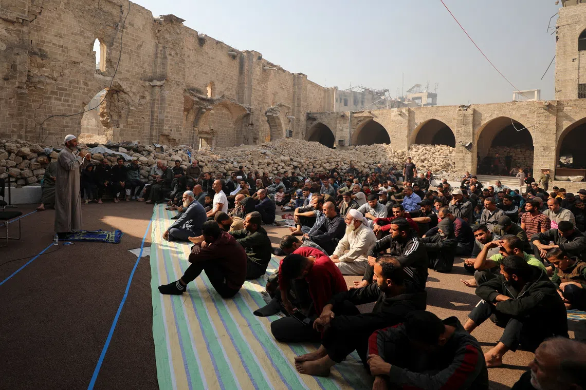 Palestinians attend Friday prayers at the Great Omari Mosque, which was damaged by Israeli shelling during the war, in Gaza City, on Nov 21.