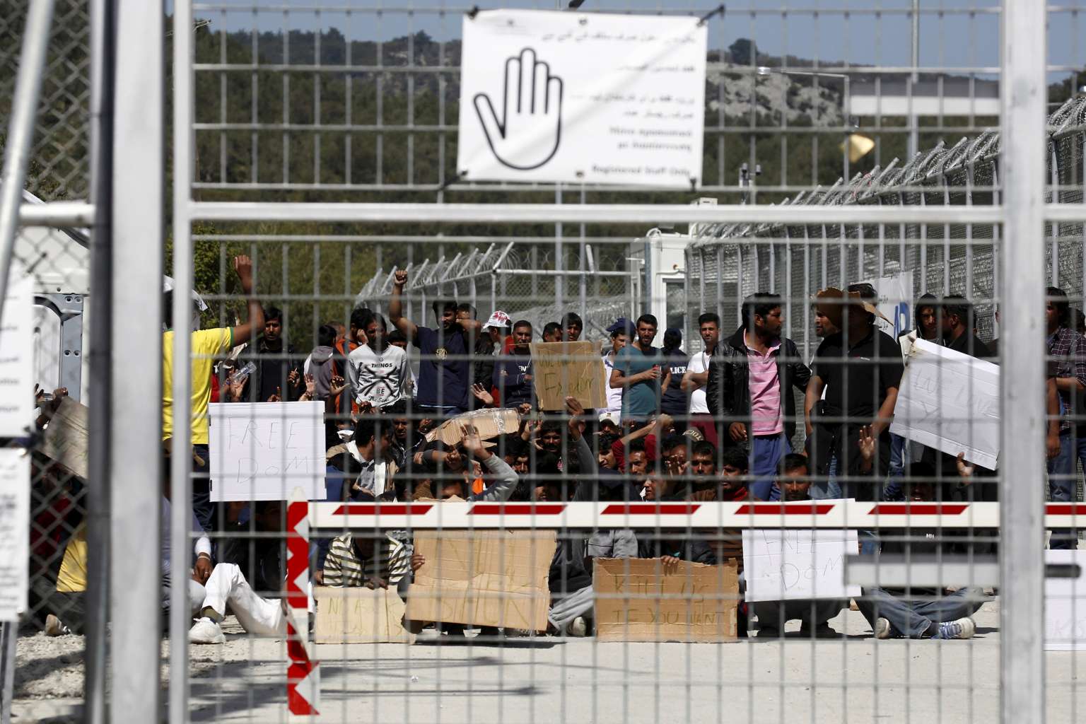 Migrants who will be returned to Turkey demonstrating inside the Moria registration centre on the Greek island of Lesbos, on April 5, 2016.