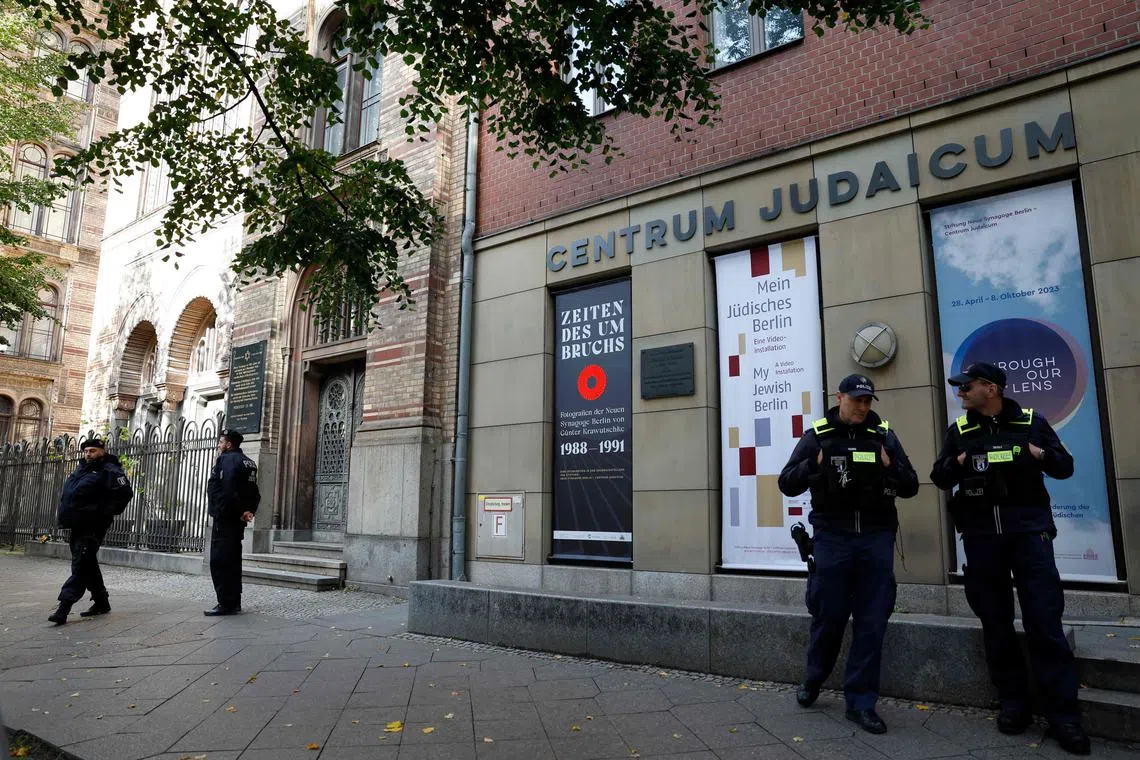 Policemen standing in front of the New Synagogue and the Centrum Judaicum in Berlin on Oct 8.