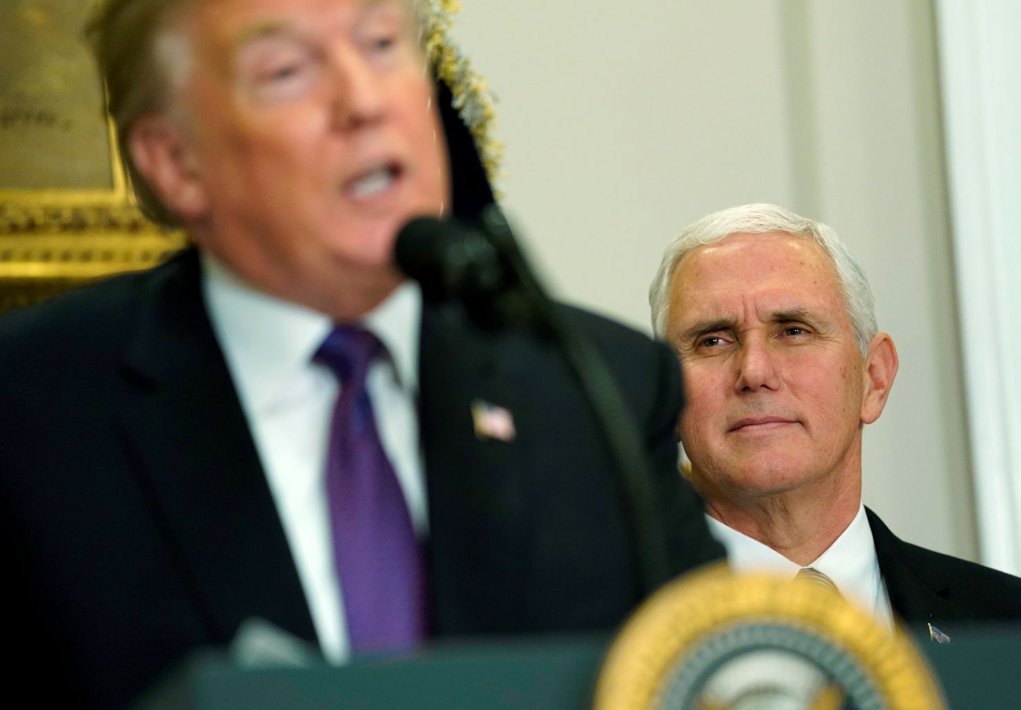 Pence watches US President Donald Trump speaking at the White House, Dec 7, 2017.