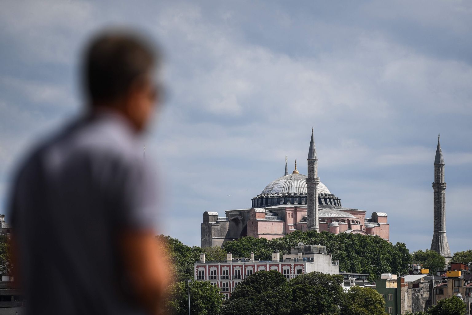 A man stays near the shore of the Bosphorus at Karakoy district on July 14, 2020, as Hagia Sophia is seen in the backround in Istanbul.