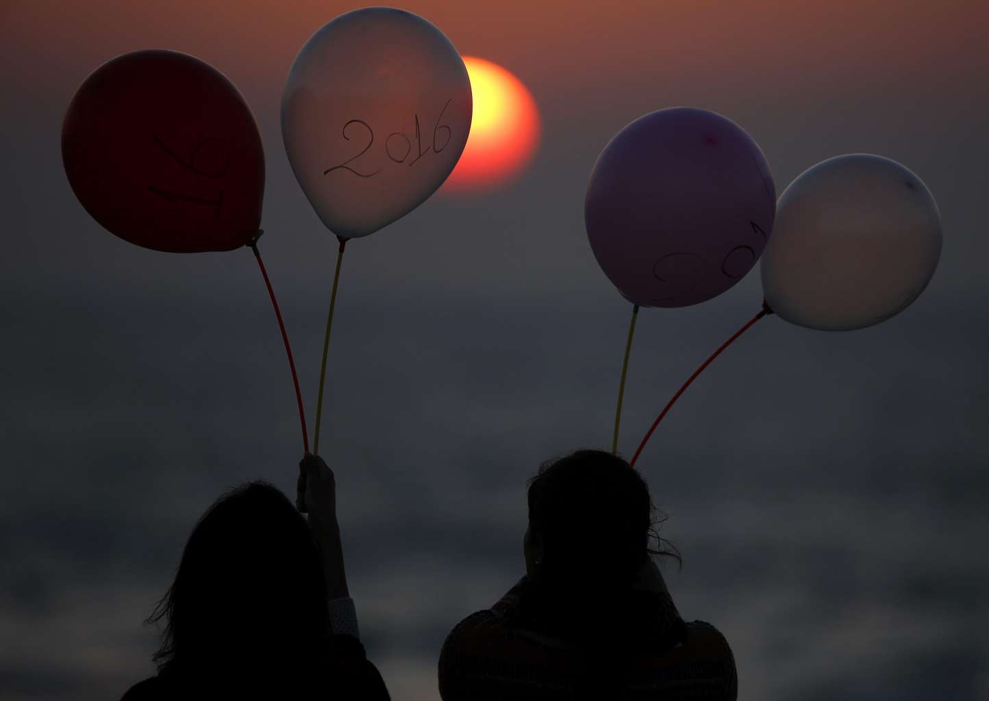 Two Palestinian girls watch the sunset holding balloons with 2016 written on one of them, in west Gaza City.