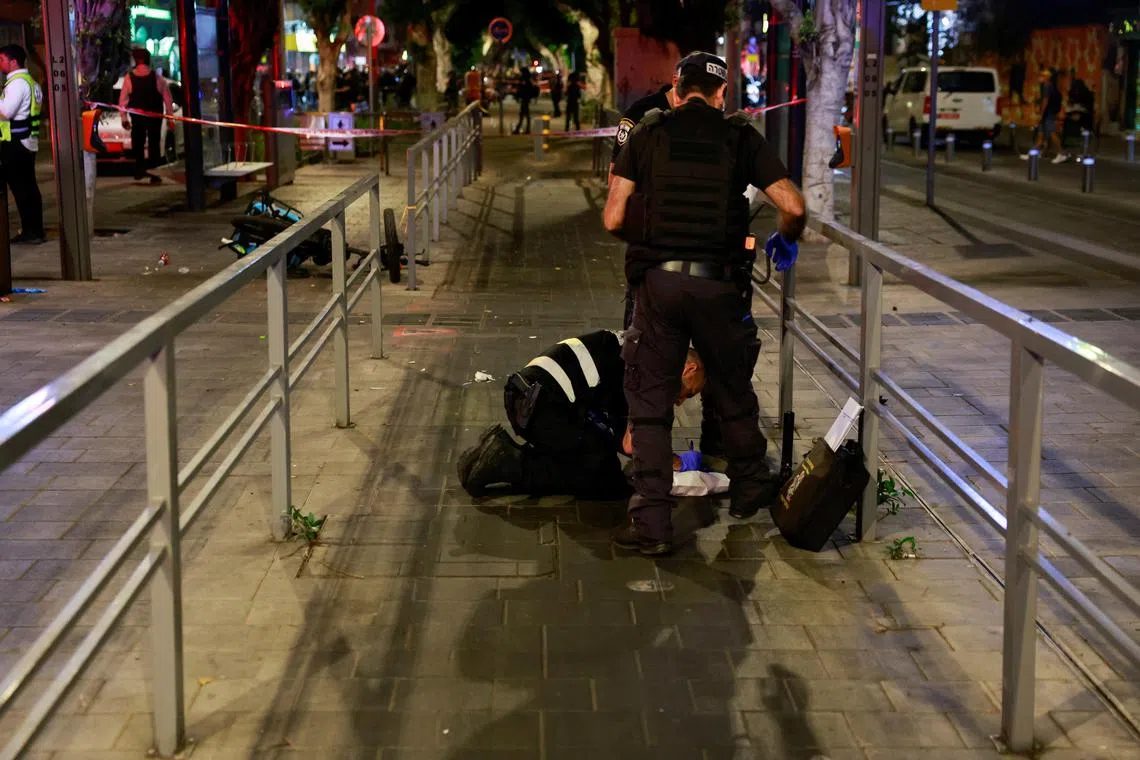 Police officers working at the site of the shooting attack, in Jaffa, Israel, on Oct 1.