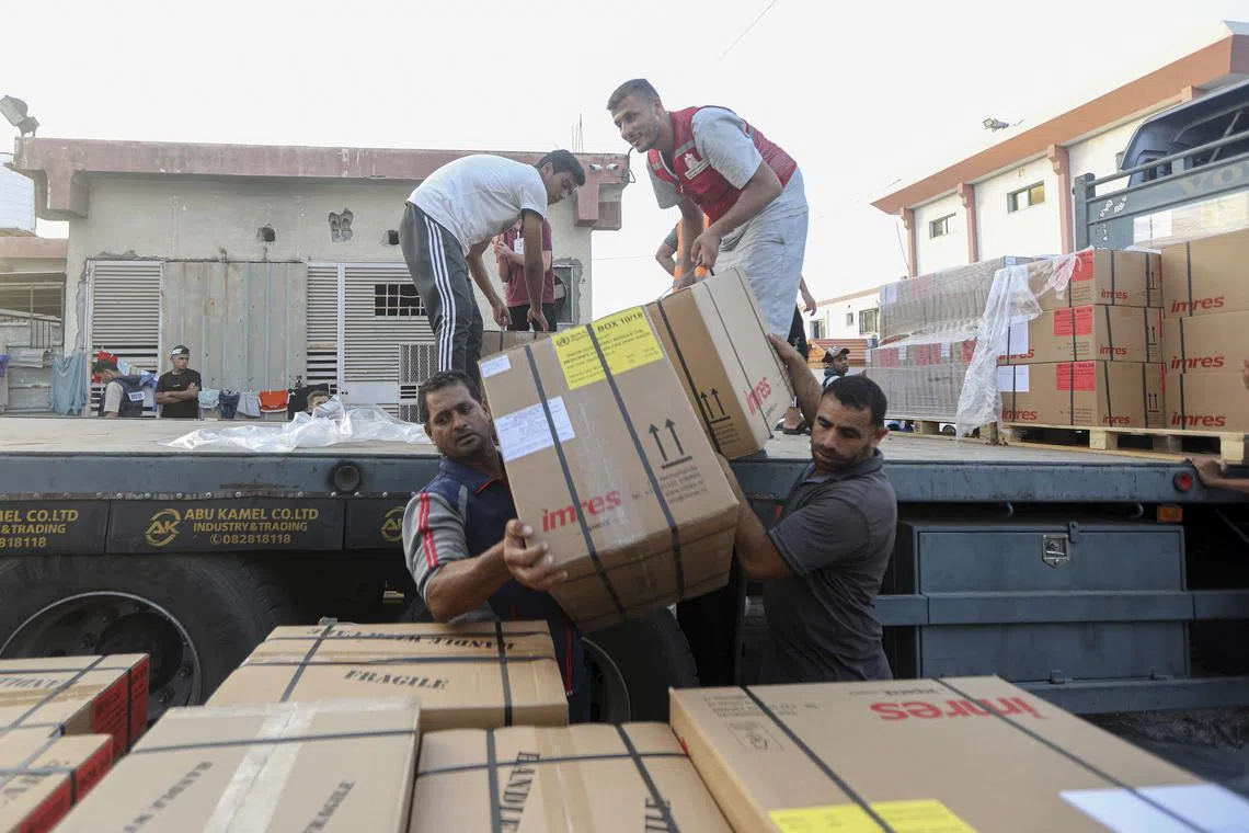 Medical aid from the World Health Organization arrives at Nasser Medical Hospital in Khan Younis in the southern Gaza Strip, on Oct 23, 2023.