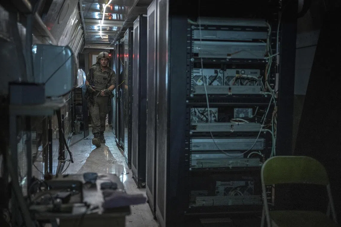 Israeli soldiers inside what they called a Hamas communications hub, reached by a tunnel underneath the headquarters of the UNRWA, as photographed during the Israel Defence Forces escorted tour.