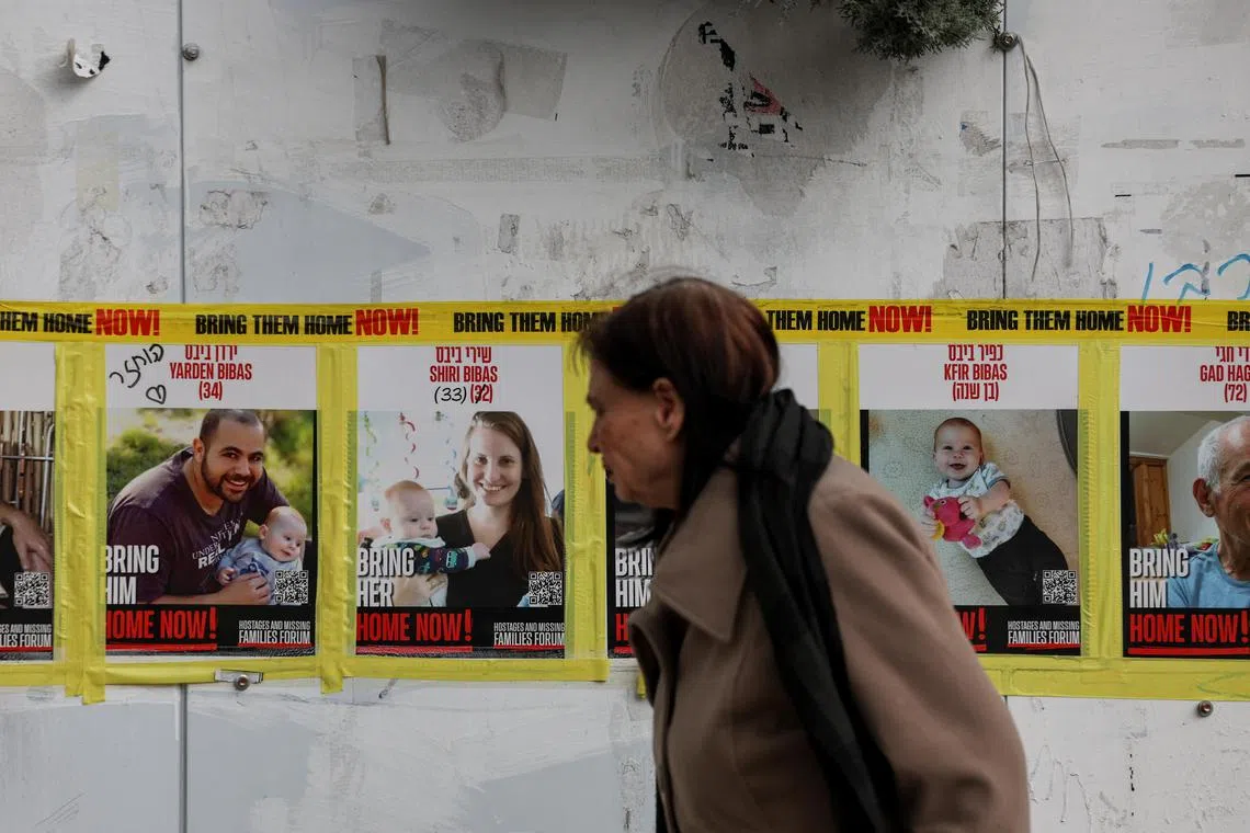A woman in Jerusalem walking past pictures of Yarden Bibas, Shiri Bibas and Kfir Bibas, who were kidnapped during Hamas’ deadly Oct 7, 2023, attack on Israel.