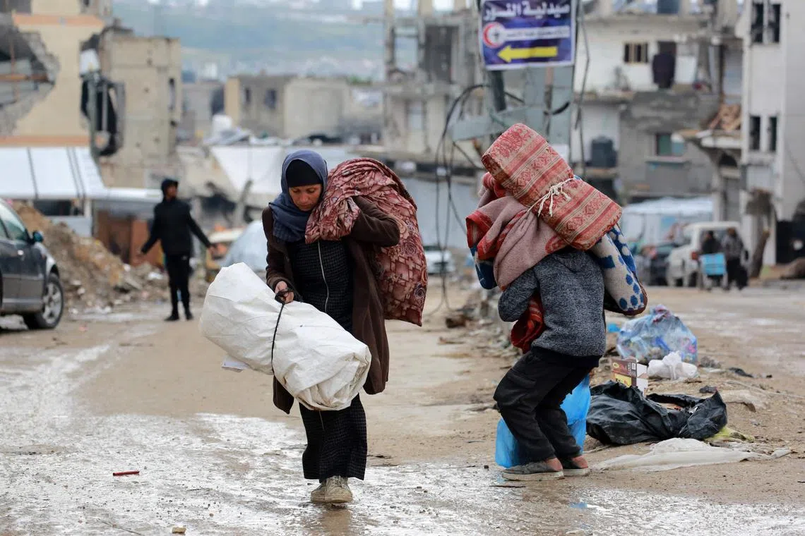 A Palestinian woman carrying her belongings as she flees Beit Lahia, in the northern Gaza Strip, on March 21.