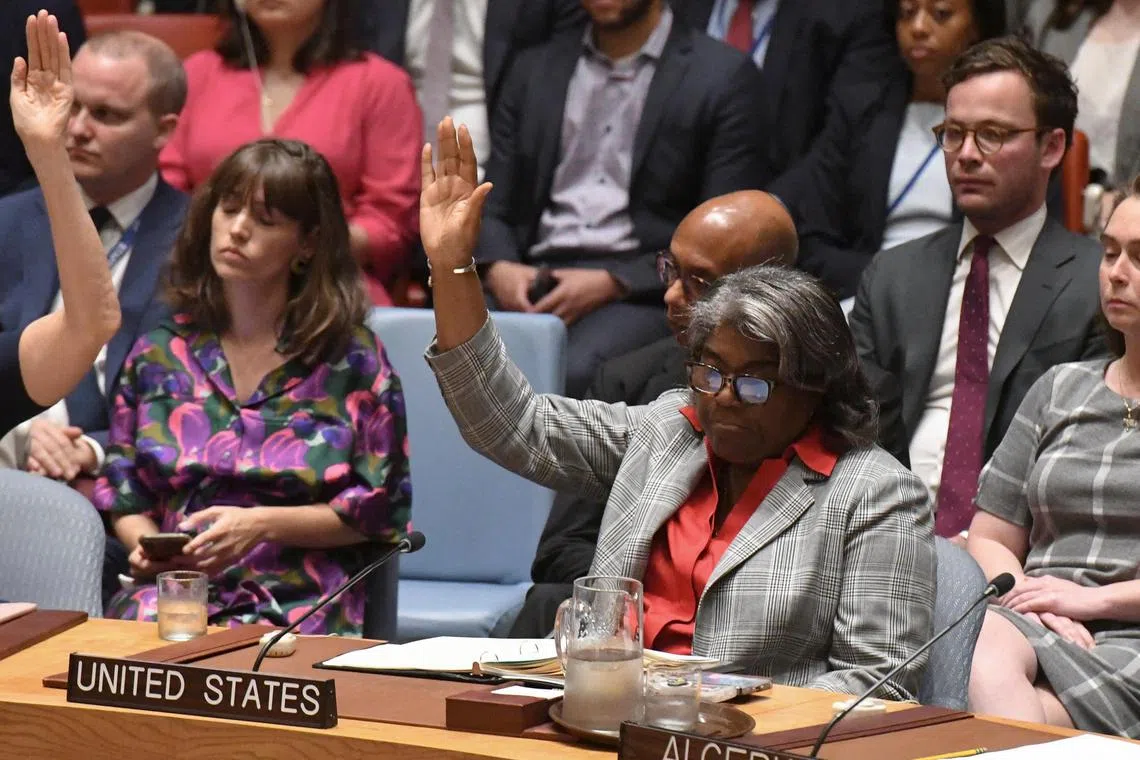 US Ambassador to the UN Linda Thomas-Greenfield voting on June 10 during a UN Security Council vote on a US-drafted resolution for a ceasefire between Israel and Hamas in the Gaza Strip.