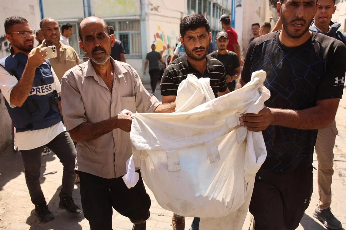 Palestinians carrying a body from the site of an Israeli strike on a school housing displaced Palestinians, in Gaza City, on Sept 21.