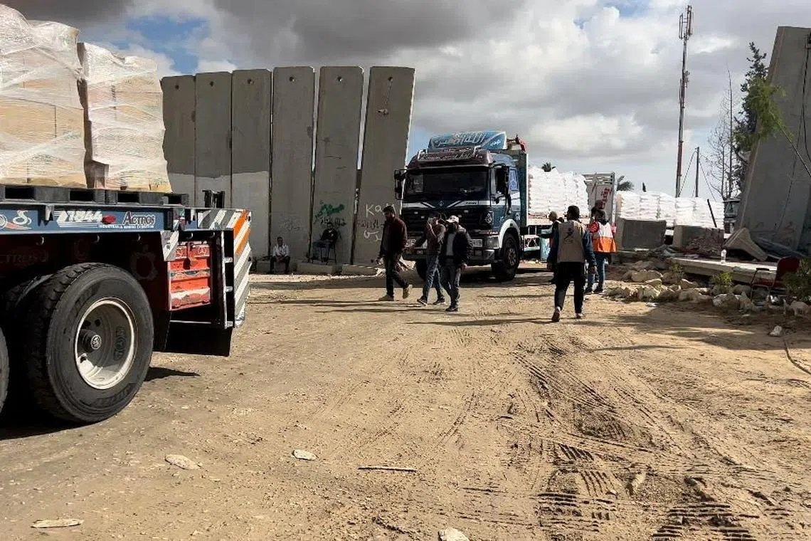 A handout picture released on Dec 2, 2023, showing a Palestinian Red Crescent team receiving a humanitarian aid truck at the Rafah border crossing between Egypt and the Gaza Strip.