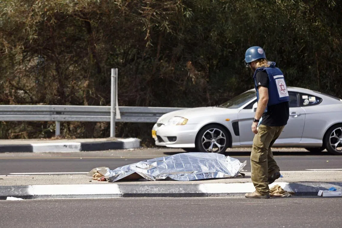 The body of an Israeli covered in a foil blanket in Sderot, Israel, on Saturday.