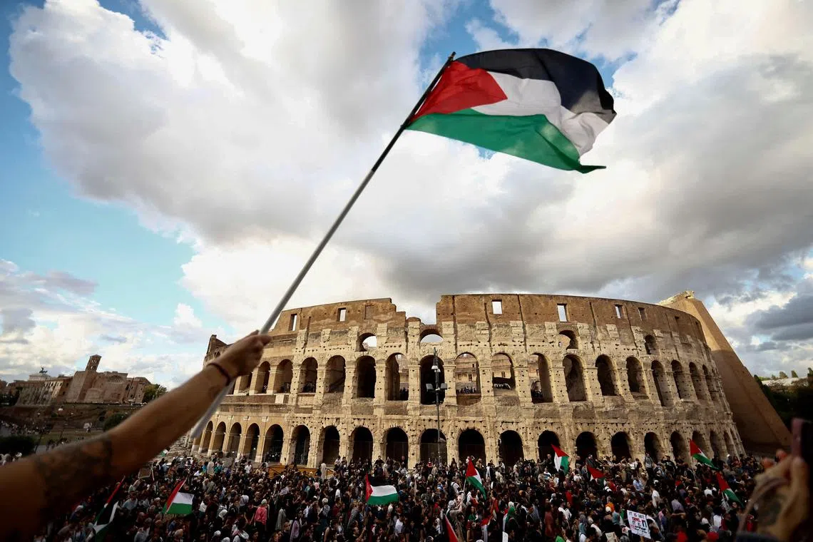 A demonstration on Oct 28, 2023, in front of the Colosseum in Rome, Italy, in support of Palestinians in Gaza.