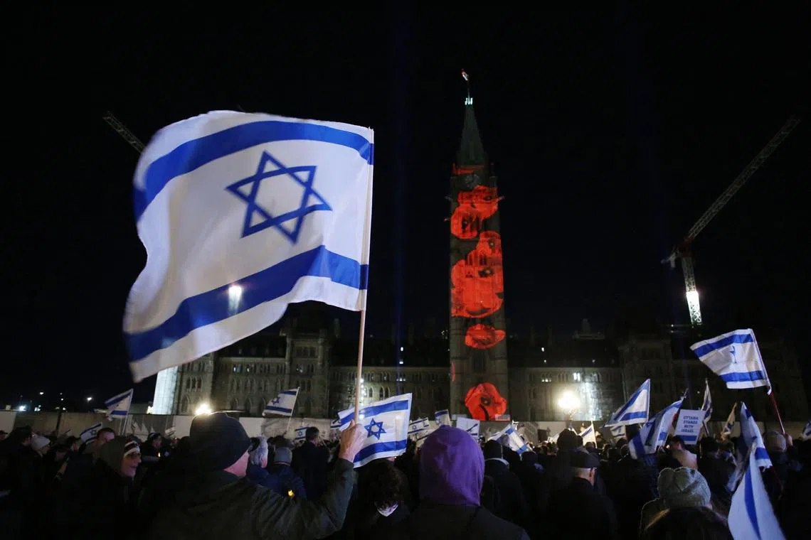 Members of the Jewish community in Ontario holding a vigil on Oct 28, 2023, for the more than 200 Israelis, including 30 children, held hostage by Hamas.