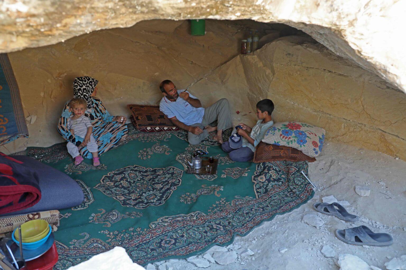 Abu Ahmad, a displaced Syrian from Termala sits with his family inside a cave he dug for shelter near the Syria-Turkey border, on Sept 9, 2019.