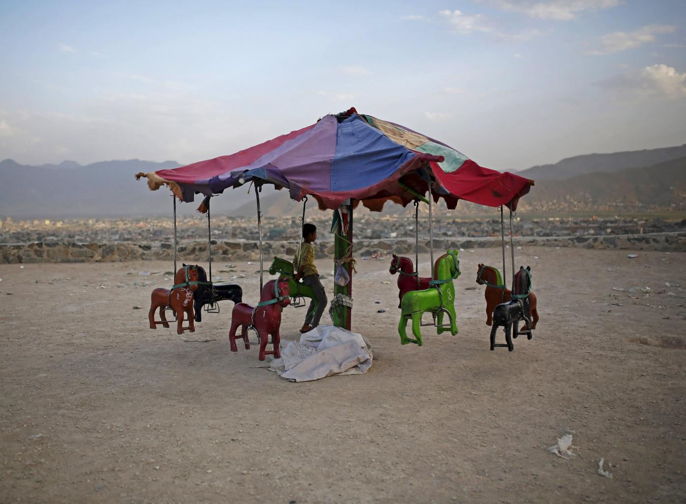 An Afghan boy sits on a merry-go-round on a hill top in Kabul.
