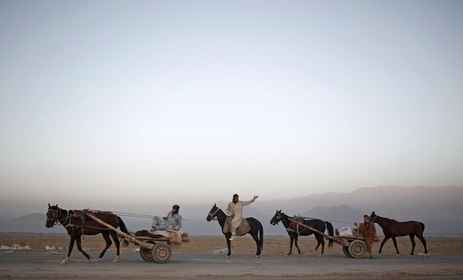 Labourers ride on their horse carts as they head to work on the outskirts of Kabul.