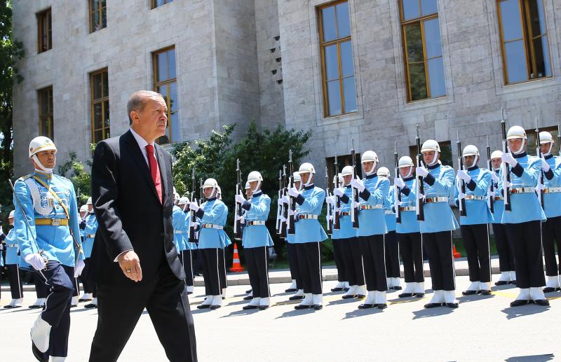 Turkish President Recep Tayyip Erdogan reviewing the honour guard as he arrives for the General Assembly of the Parliament in Ankara, Turkey on July 15, 2017.
