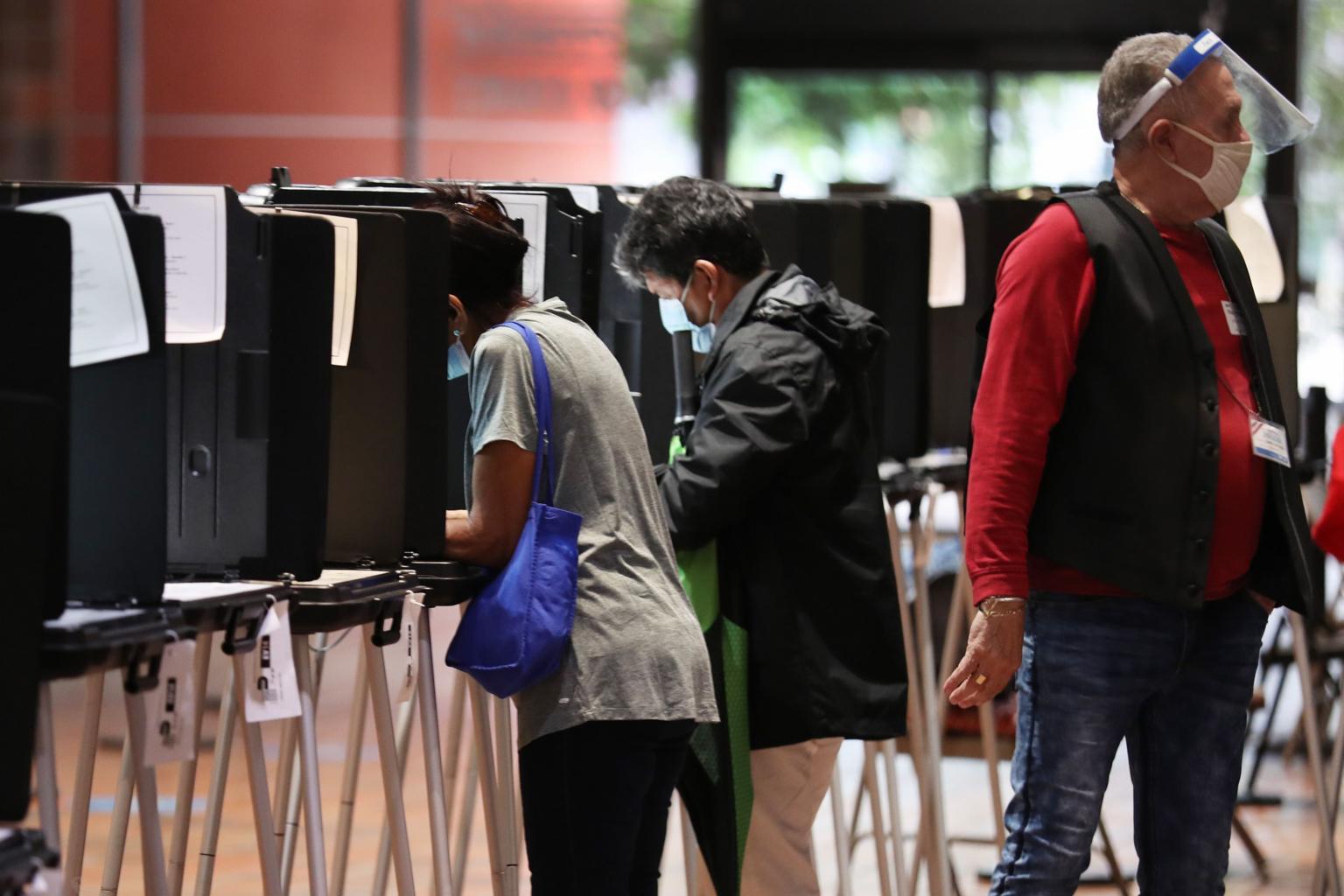 Voters fill out their ballots at a polling station in Miami on Oct 21, 2020.