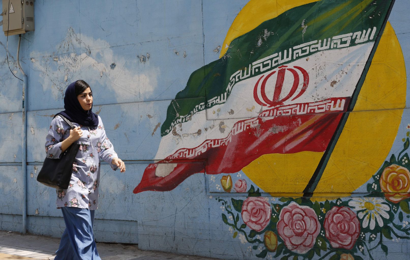 A woman walks in front of a mural painting depicting the Iranian flag, in the capital Tehran, on Aug 6, 2018.