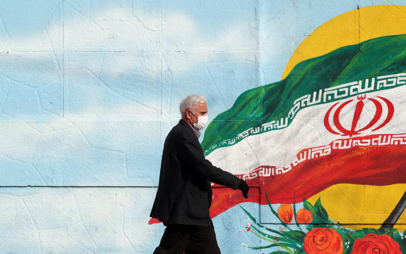 A man wearing walks past a mural depicting the Iranian flag along a street in Teheran on Feb 29, 2020.