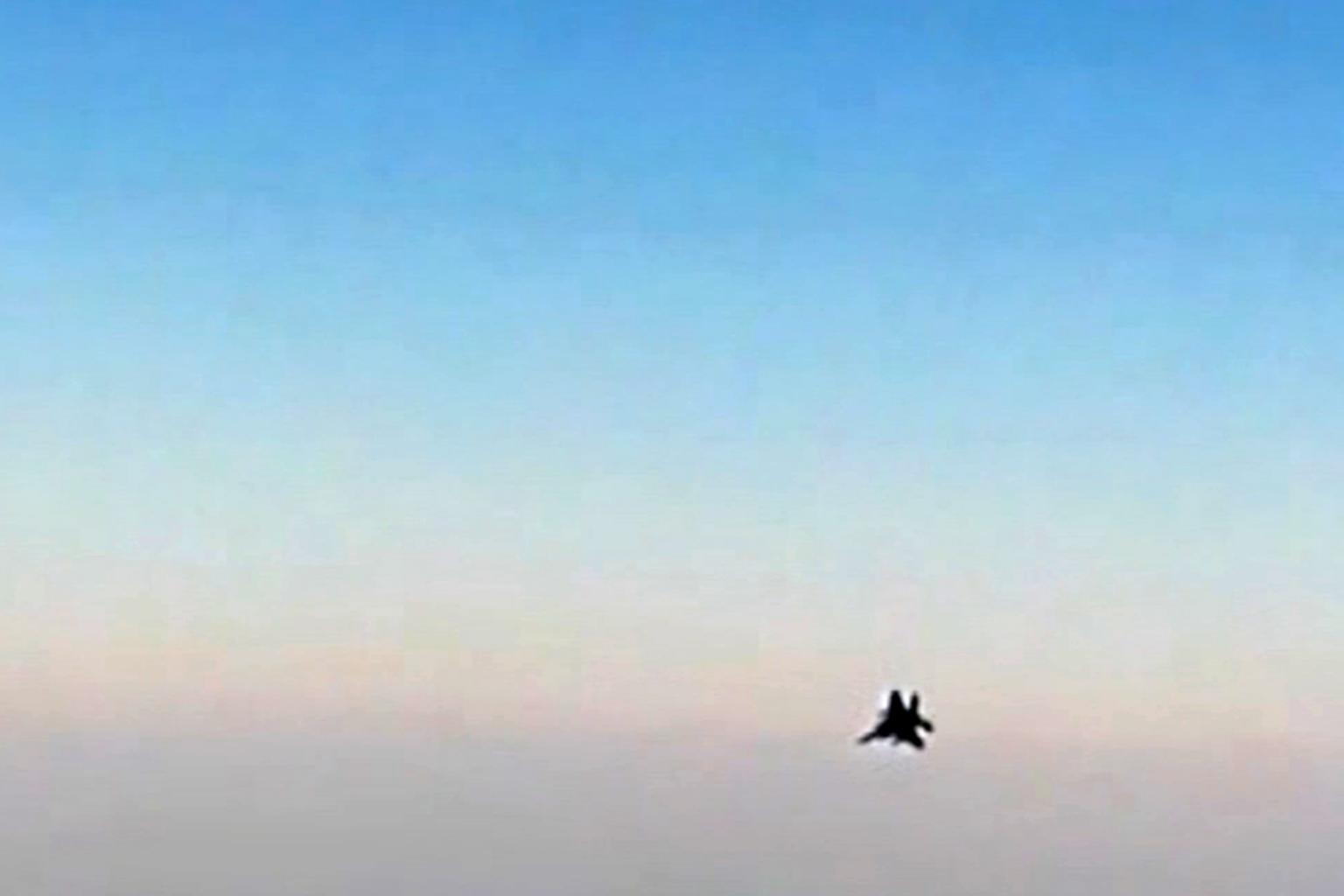 An image grab from a video released by state-run Iran Press news agency on July 24, 2020, reportedly shows a fighter jet after it was intercepted by a US F-15 while flying over Syria.