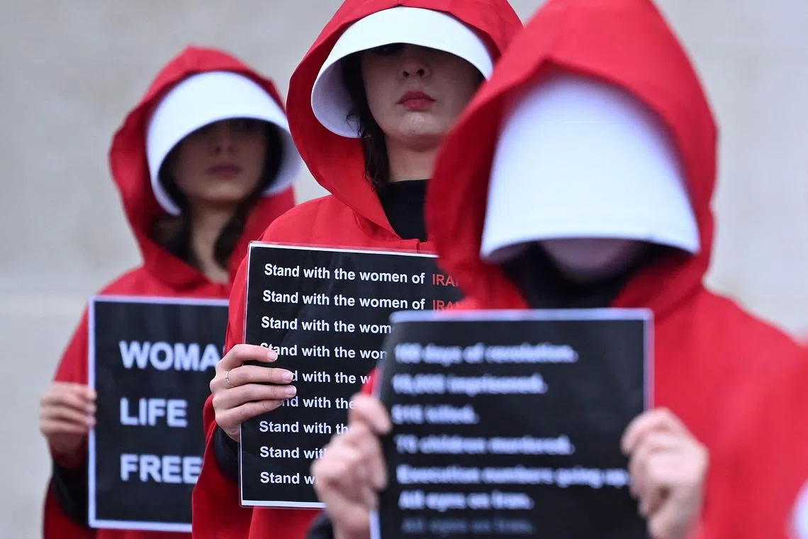 Protesters wearing ‘Handmaid’s Tale’ costumes hold a silent march in central London on Jan 7 to raise awareness about the recent women-led uprising in Iran.