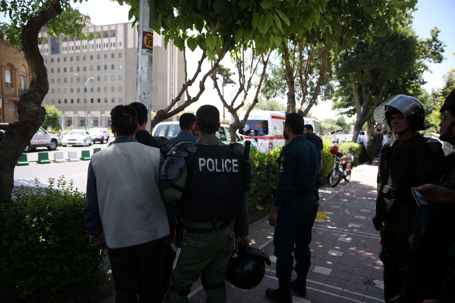 Iranian police stand near the parliament's building during a gunmen attack in central Tehran, Iran, June 7, 2017.