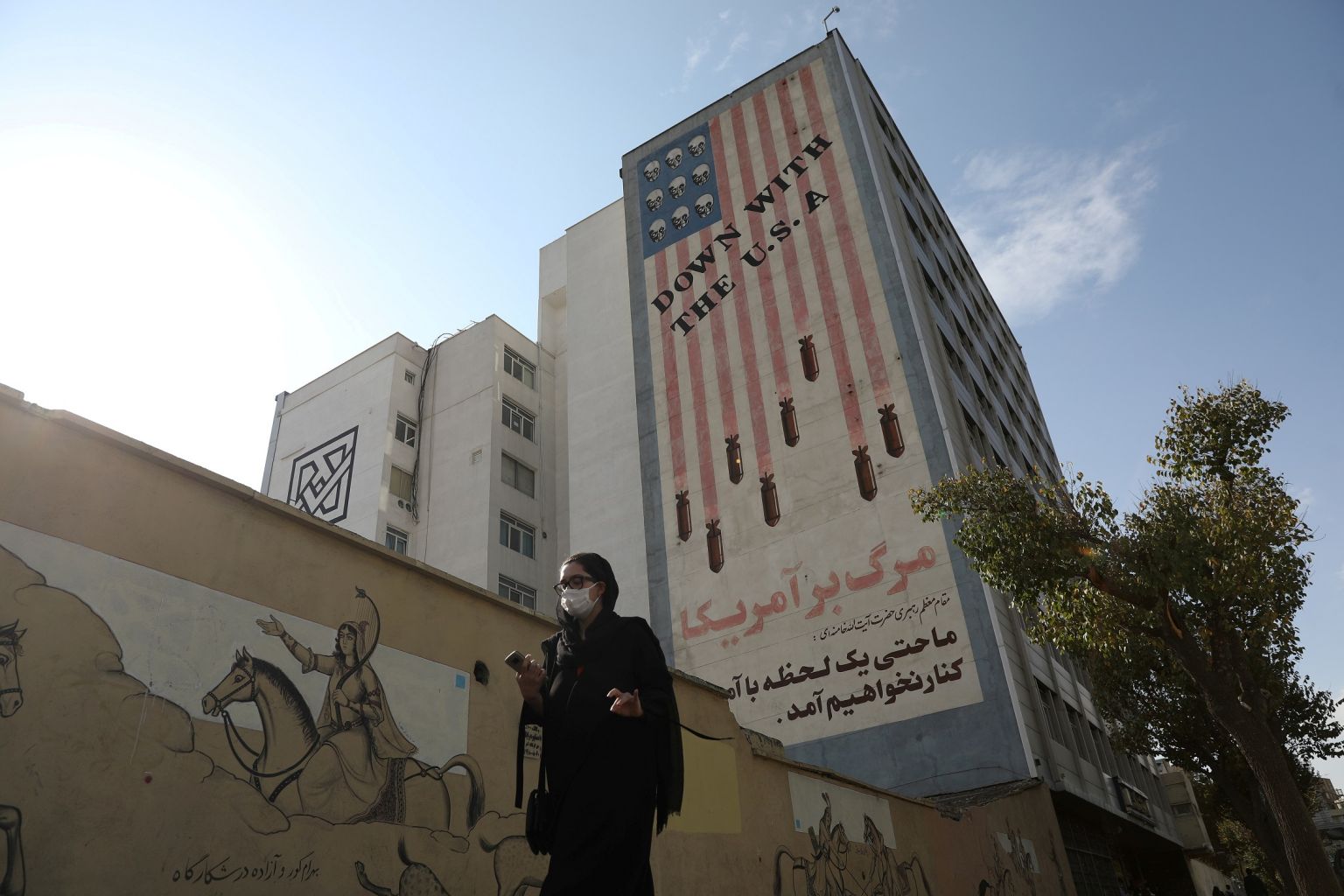 A woman walks along a Teheran street with an anti-America image seen on a building.