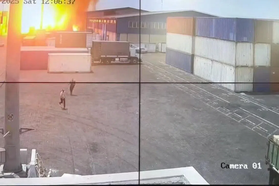 CCTV footage shows fire from the explosion at the Shahid Rajaee port in Bandar Abbas, Iran.