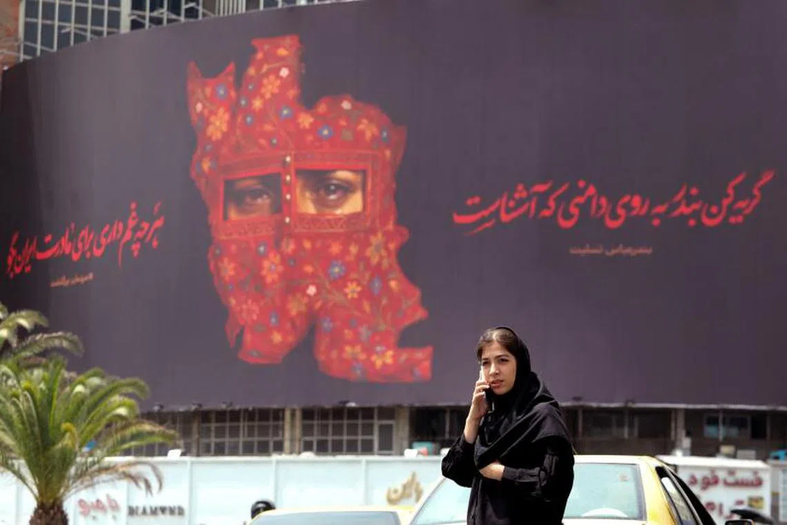 A large banner depicting an Iranian woman mourning in a traditional dress, against a slogan in Farsi reading ‘Condolences Bandar Abbas‘ on a building facade in Tehran.
