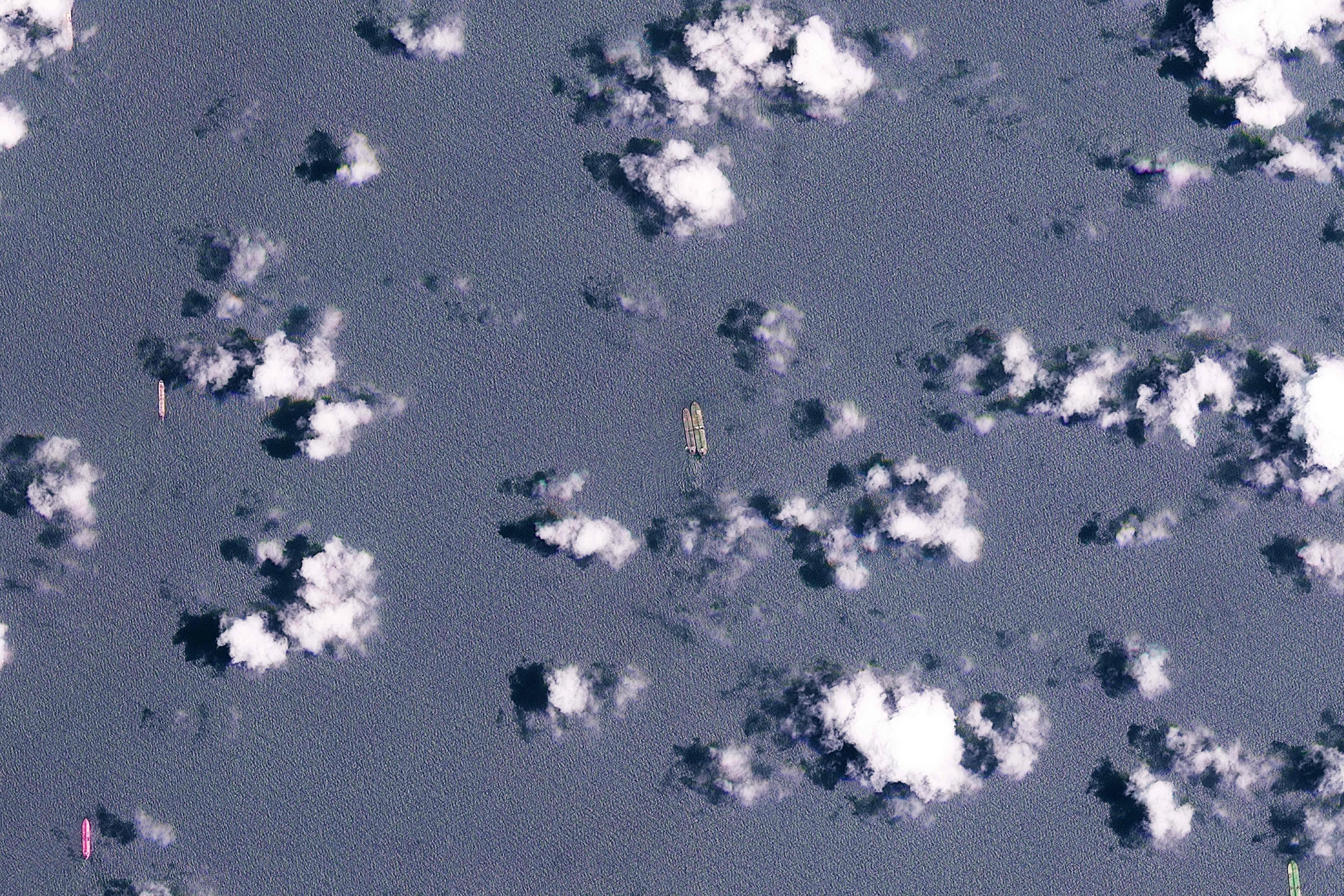 A satellite image released by Planet Labs shows two vessels conducting what appears to be an offshore cargo transfer off the south-east coast of the Malay Peninsula, near Singapore, on March 24.