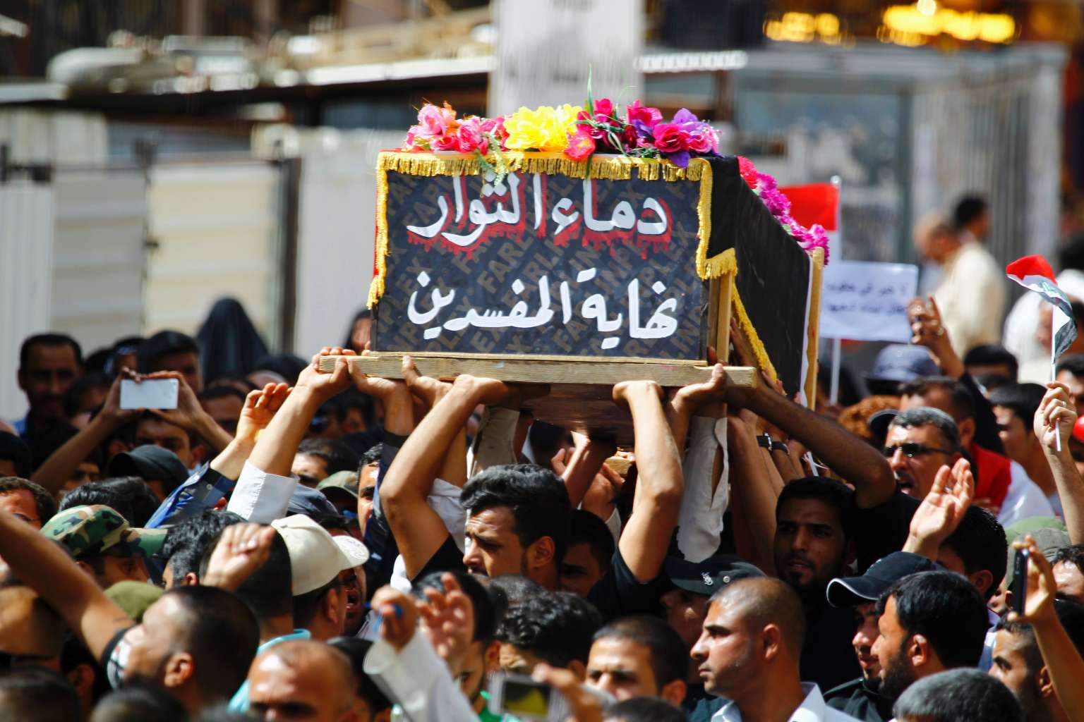 Iraqi men carry the coffin of an anti-government protester, who was killed the day before during clashes with the security forces guarding the Green Zone compound, in the city of Najaf on May 21, 2016.
