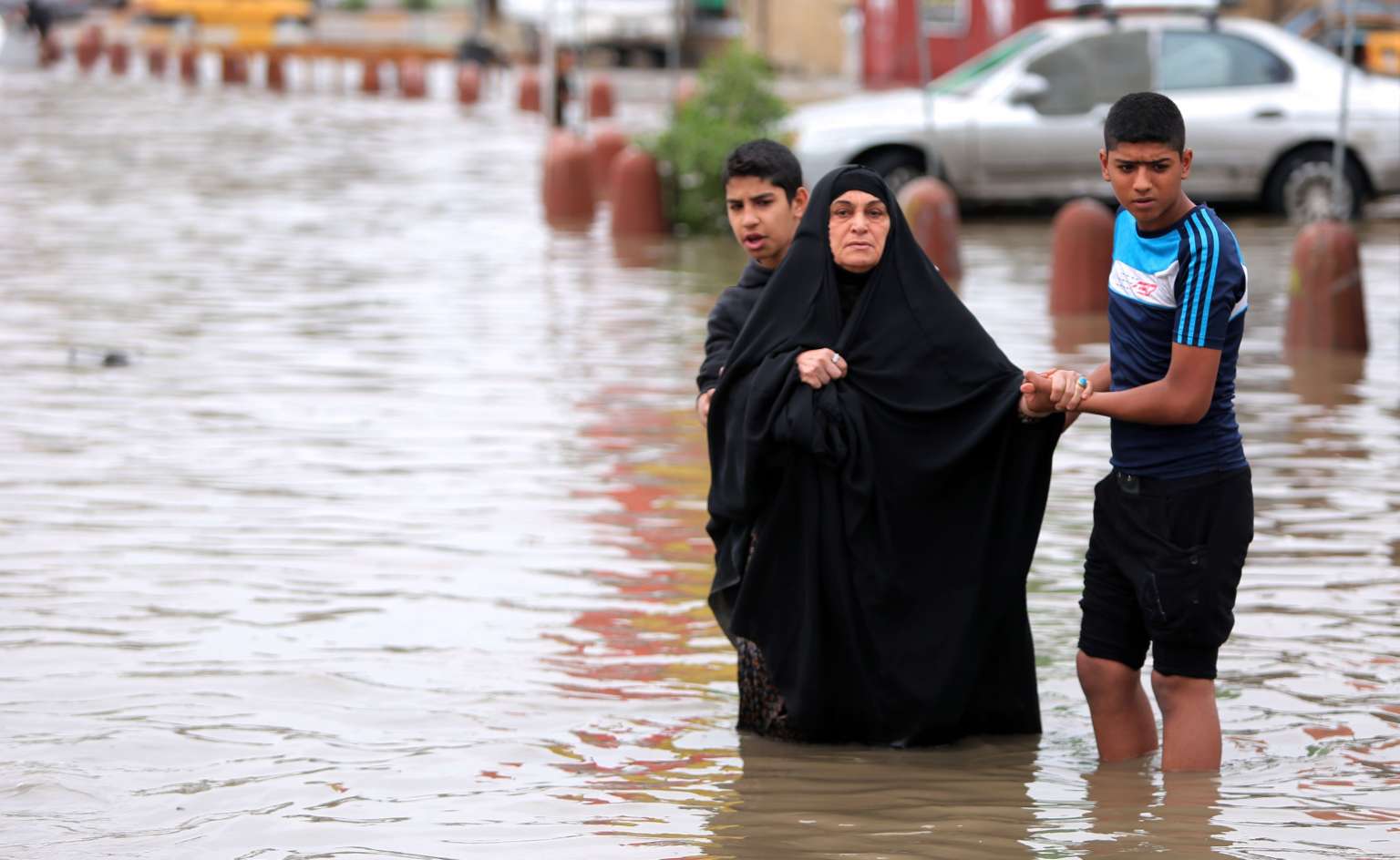 Iraqi youths help a woman cross a flooded street after heavy rainfall in the capital Baghdad, on Oct 29, 2015.