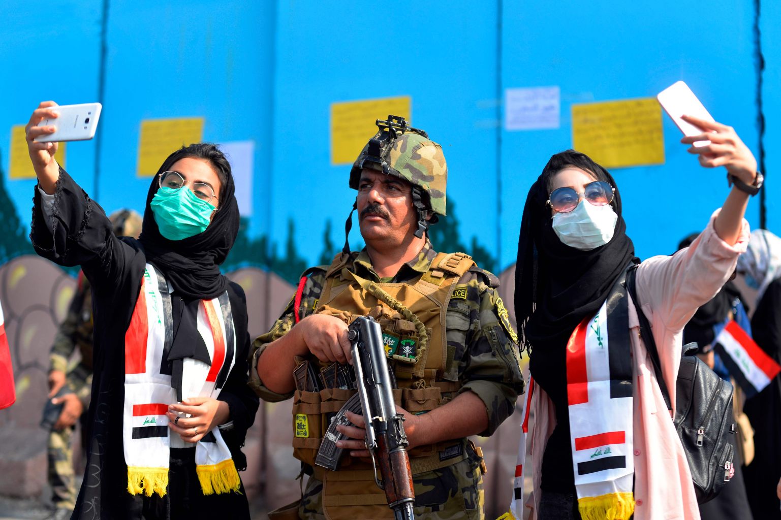Iraqi students pose for selfies with a member of the security forces during ongoing anti-government protests in the central city of Diwaniyah on Oct 31, 2019.